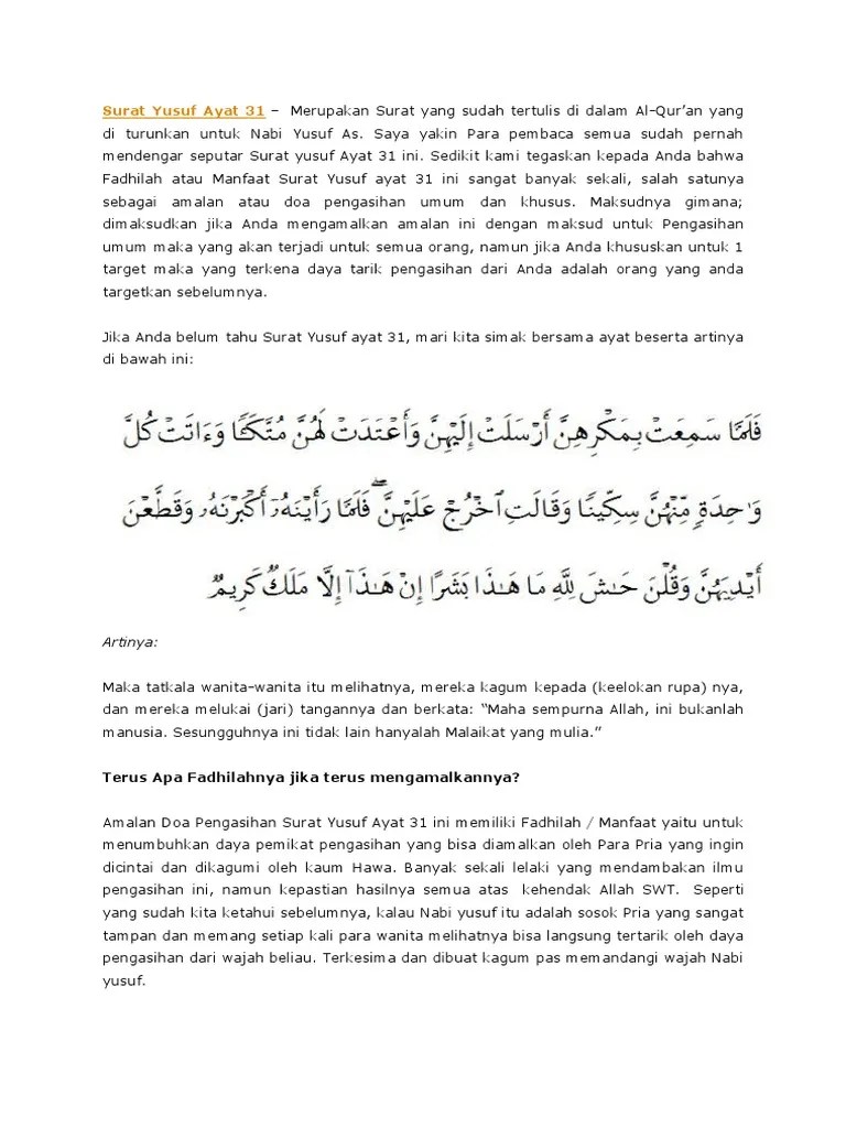 Apa doa nabi yusuf agar dicintai wanita? Yuk cari tahu di bawah ini! Amalan doa nabi yusuf akan membuka aura ketampanan pria. Singkat cerita, akhirnya ia dikeluarkan karena kebenaran tentang sifat ketampanan . Inilah doa pengasihan nabi yusuf paling ampuh. Doa pengasihan ini diambil dari kisah nabi yusuf saat beliau . Doa pengasihan nabi yusuf ini dikutip dari potongan alquran surat yusuf ayat 4. Amalan ini sangat mustajab untuk mengubah aura yang redup menjadi lebih terang. Idz qaala yuusufa li abiihi yaa abata innii ra aitu ahada 'asyara kau kabau wasyamsa wal . Idz qaala yuusufa li abiihi yaa abata innii ra aitu ahada 'asyara kau kabau wasyamsa wal qamara ra aituhum li saajidiin. Allaahummaj'alnii nuuru yusufa ala wajhii fa man ro aanii yuhibbunii mahabbatan. Allahummaj 'alnii nuuru yusufa ala 'wajhii fa man roaanii yuhibbunii mahabbatani. artinya: Doa pengasihan nabi yusuf ini memiliki cukup banyak manfaat dan kiat kiat khusus dalam mengamalkannya. Ilustrasi doa pengasihan nabi yusuf. Ya allah ya tuhan kami, jadikanlah cahaya (ketampanan) nabi yusuf as atas wajah ku, barang siapa melihat ku dia menjadi kagum dan . "ya allah, jadikanlah nur cahaya nabi yusuf pada .
